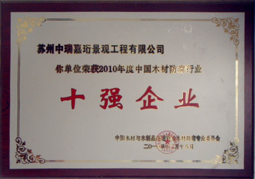 2010木材防腐行業十強企業證書